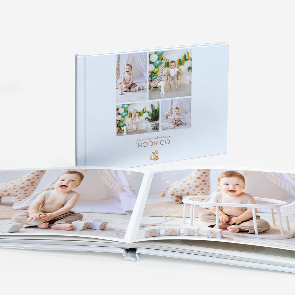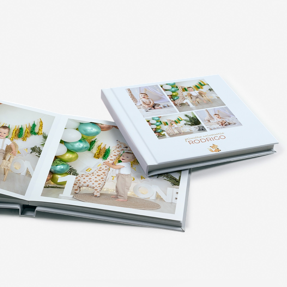 A capa rígida em cartão duro oferece proteção adicional e um acabamento elegante ao teu álbum.