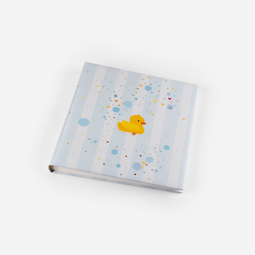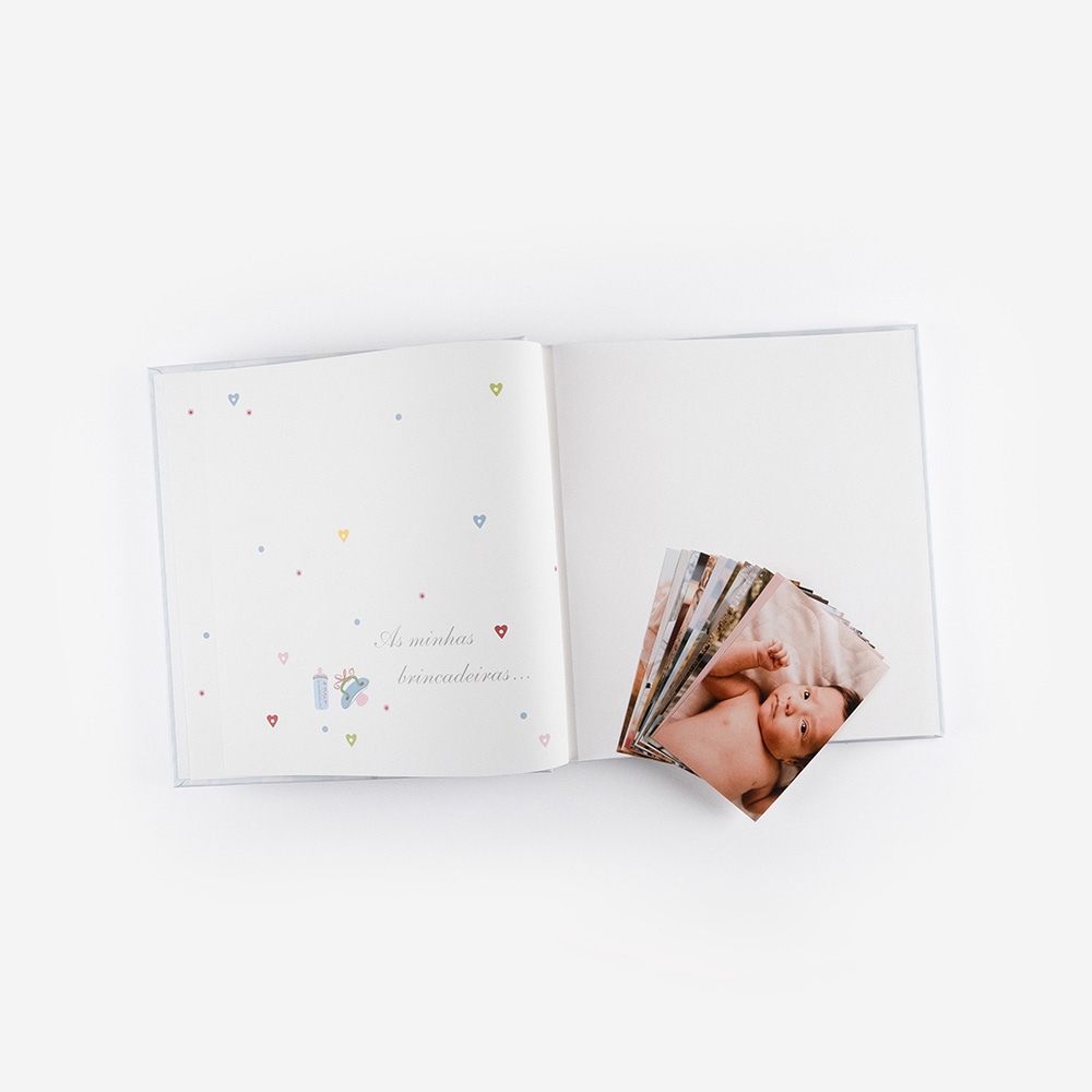 A capa dos Álbuns Analógicos Infantis possui uma impressão artística com relevo dourado e estão disponíveis em azul e Rosa.