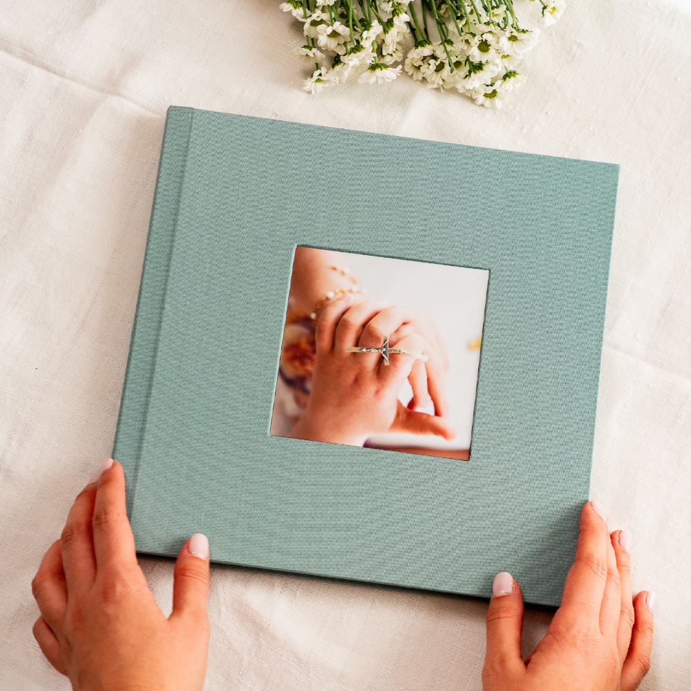 A janela do modelo Cameo é mais do que um detalhe, é uma declaração. A fotografia de 11 x 11 cm é impressa e cuidadosamente embutida na capa, fazendo parte da sua estrutura. Não é um encaixe para troca, mas sim a peça central e permanente do design do álbum. O tamanho da janela é o mesmo em todos os formatos, garantindo sempre o protagonismo da imagem.