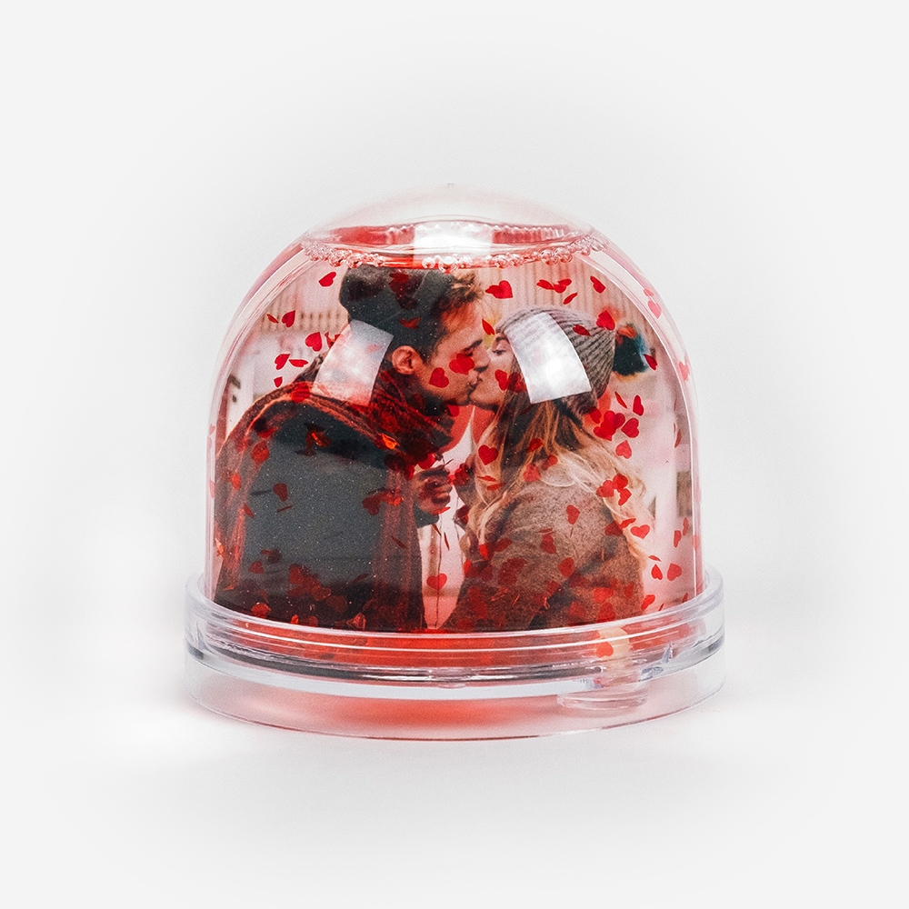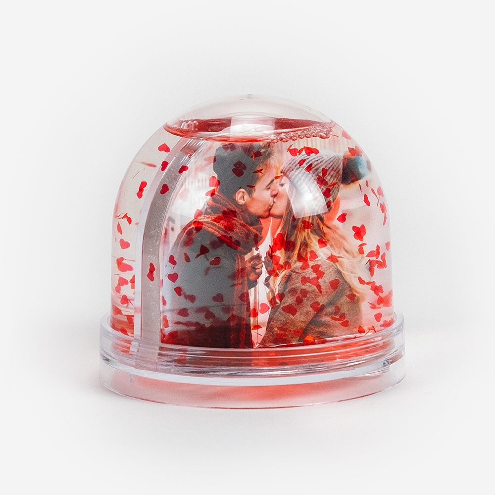 Com dimensões de 9 x 8 cm, permite personalizar 100% do seu interior. Podes escolher duas fotografias e optar pelo efeito de neve ou por corações vermelhos, para um resultado único e especial.